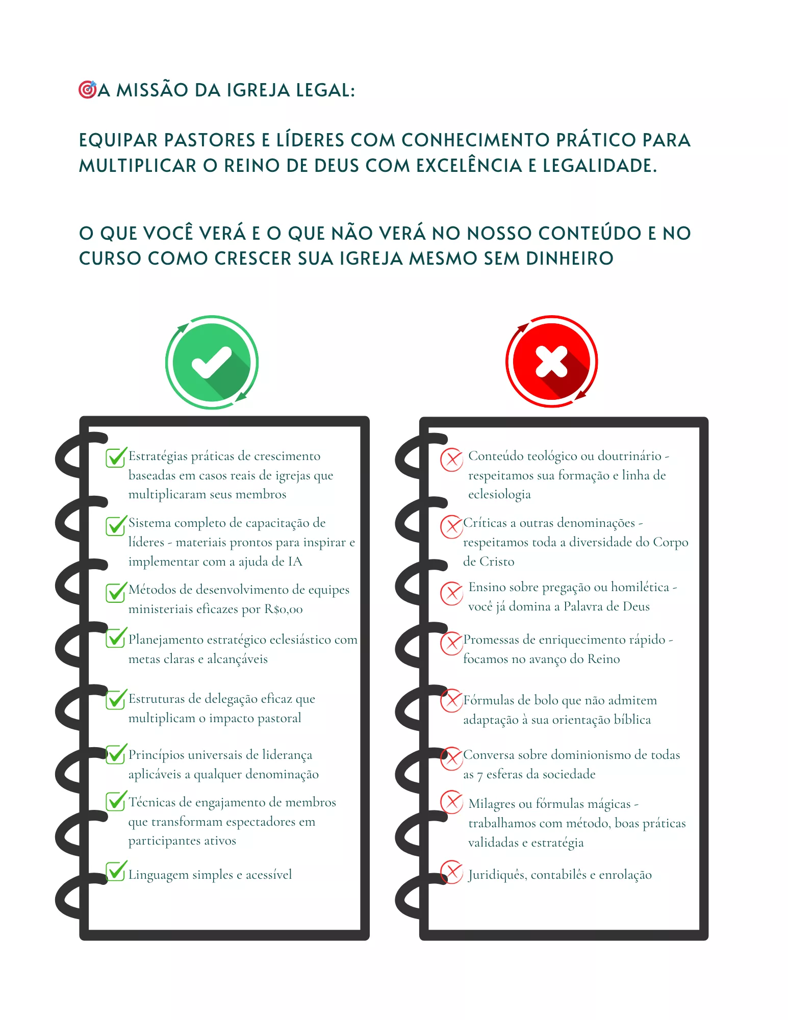Pra te mostrar o caminho certo, na ordem certa, com vídeo-aulas simples e materiais práticos, para você aplicar junto com sua liderança e ver sua igreja organizada, protegida e crescendo de verdade.